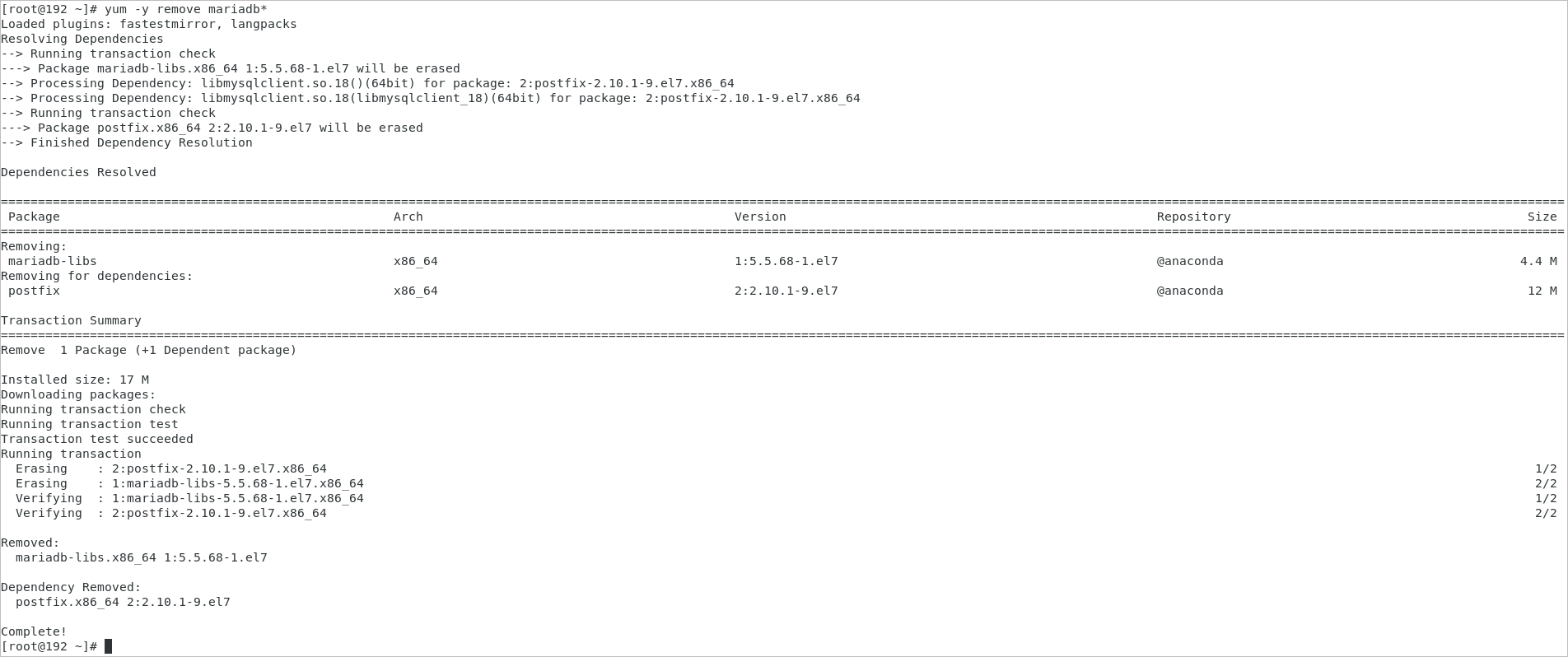 By default CentOS 7.x comes with some modules of MariaDB installed. So we need to uninstall them.