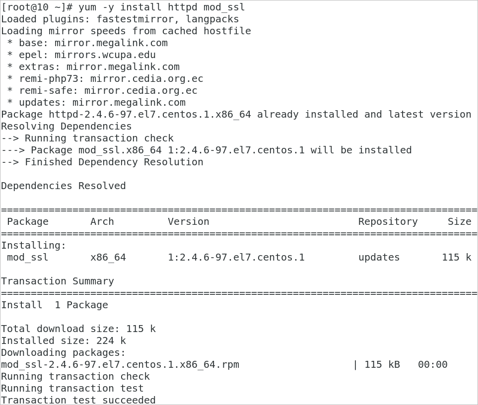 mod_ssl is an Apache module that provides SSL v2/v3 and TLS v1 support for the Apache HTTP server necessary for ProcessMaker. Run the commands in the following steps to install Apache 2.4 and the SSL module: