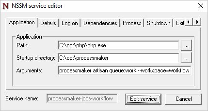 nssm install processmaker-jobs-workflow The last command displays a window with several tabs. Go to the Application tab.