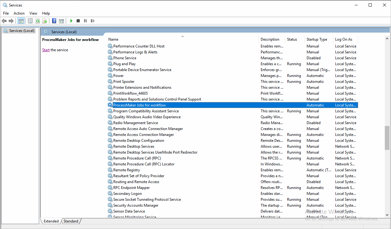 nssm start processmaker-jobs-workflow Alternatively, you can open the Windows Services Panel, look for the created service and stop and start it: