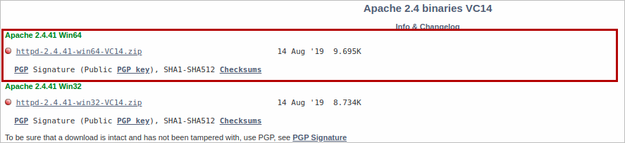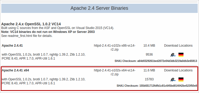 Download the Apache 2.4.x VC14 binary file (64-bit version) from the Apache Haus or Apache Lounge page.