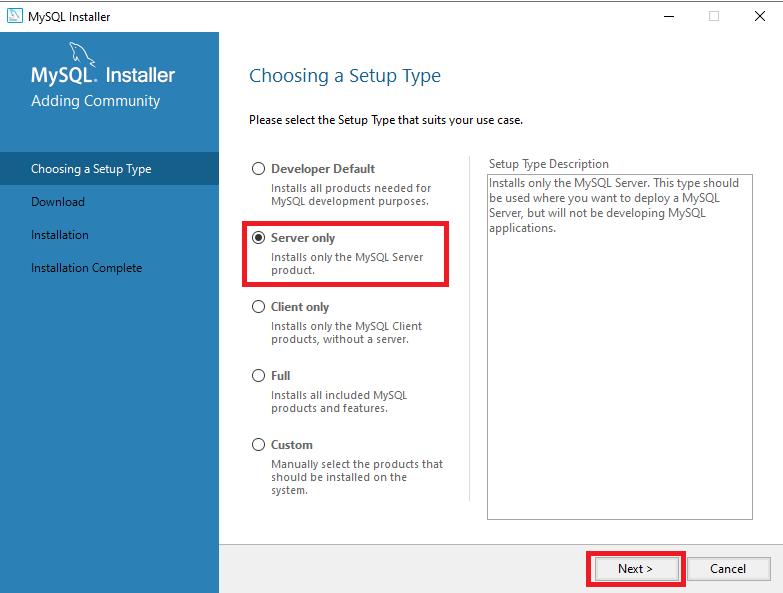 The Choosing a Setup Type screen displays. Choose the setup type according to the type of use. (Server only is generally recommended.) Click Next.