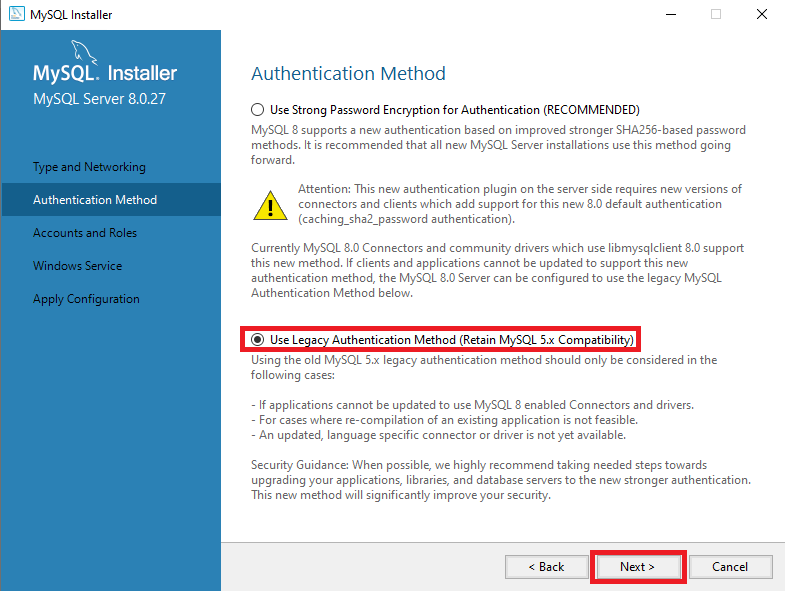 The Authentication Method screen displays. It is recommended to select Use Legacy Authentication Method (Retain MySQL 5.x Compatibility) to maintain previous MySQL authentication method. Click Next.