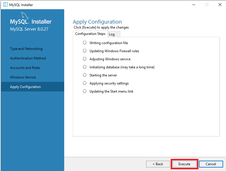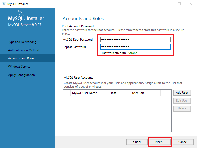 For more information about the Accounts and Roles step, visit the page MySQL reference manual.