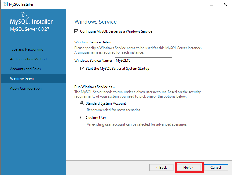 The Windows Service screen displays. Select the Configure MySQL Server as a Windows Service and Start the MySQL Server at System Startup checkboxes. Select the Standard System Account. Click Next.