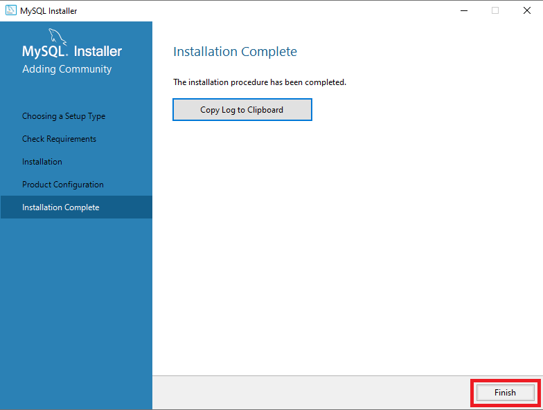 The Installation Complete screen displays. Click Finish. The MySQL installation is complete.