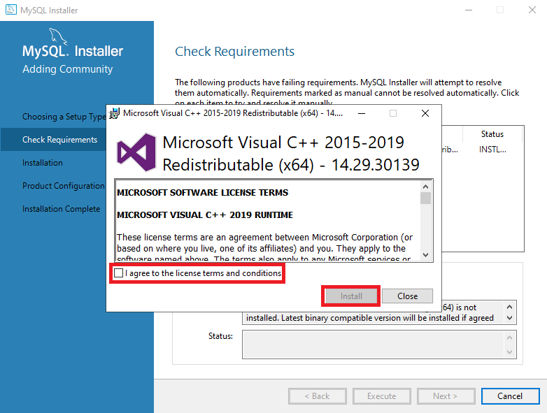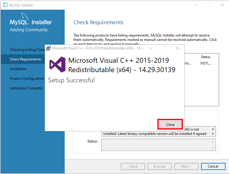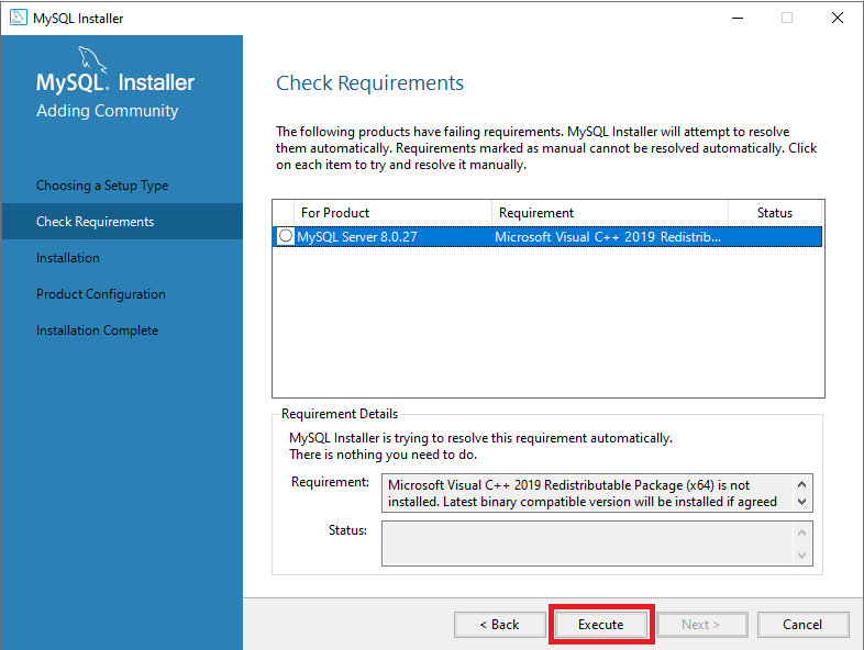 The Check Requirements screen displays. Check the requirements and click Execute to perform the installation of any missing dependencies.