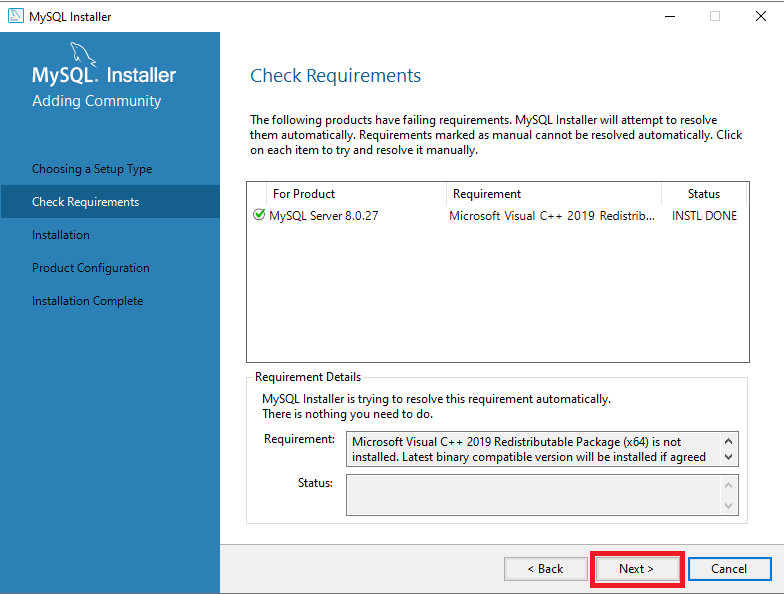 After the installation is done, the approved requirements displays. Click Next to complete the server configuration.