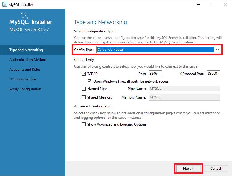 The Type and Networking screen displays. This screen displays default configuration settings. In the Config Type field, it is recommended to select Server Computer. Click Next.