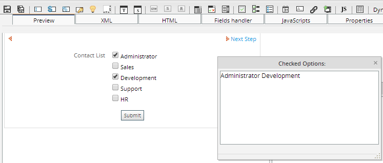 The above example obtain the value of the checkgroup and then replace the break line with no space between options, the final result will be: