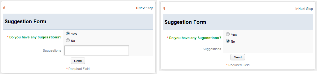 So the Suggestions textarea field will be hidden only if the user checks the option "No" and the validation of the radiogroup will be "False" otherwise the textarea will be displayed as the image below:
