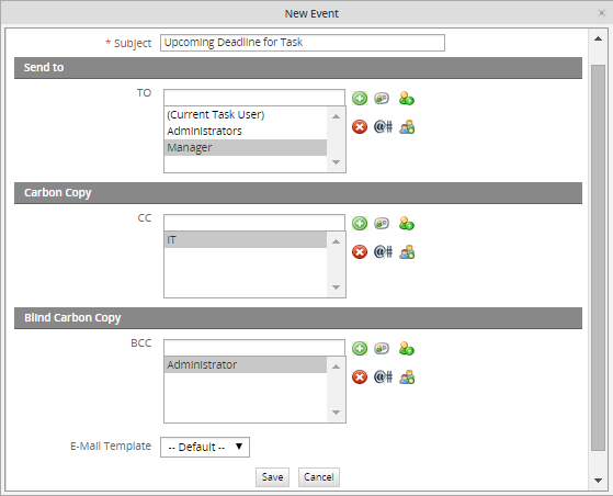 - Blind Carbon Copy: Add email addresses or users to receive a blind carbon copy of the email, which means that the other recipients will not be informed that the BBC recipients were sent the email.