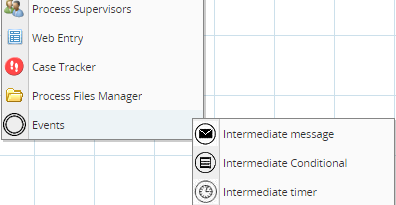 To create a new event, right click on a blank area in the process map and choose Events from the dropdown menu and the three options will display: