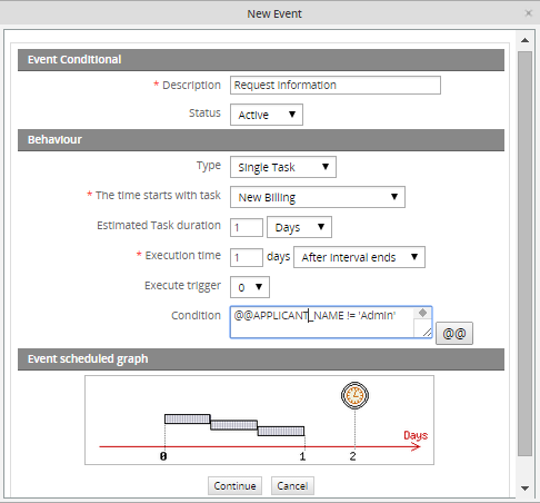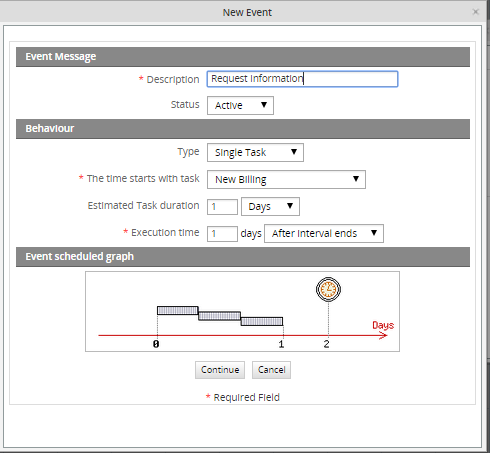 Note: It's important to mention that the event will be running during the execution of the task scheduled, if the task is derivated the event will be closed and it won't be executed. For instance, if an event is created to remember to a certain user that a case is on his/her inbox, the event will remember the user to open that case to check and complete it, and the event will be available during the execution of that particular case.