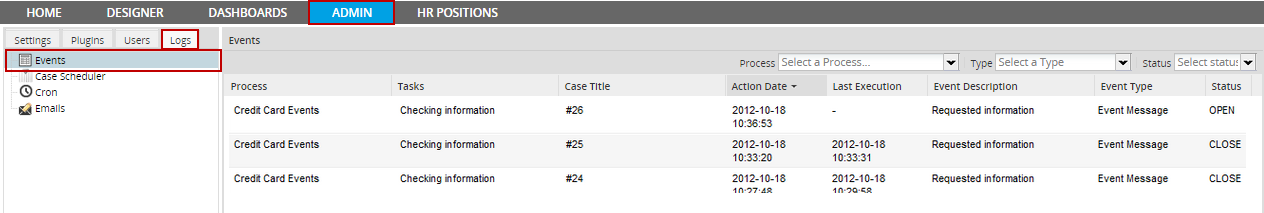 From version 2.0.44 an event log was added inside Administration tab, only users with PROCESSMAKER_ADMIN and PROCESSMAKER_MANAGER role will have access to the event log