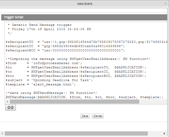 Events can either send an email message or execute a trigger. From version 2.0 and later, three types of conditional events can be added, so events can be executed based upon the state of a particular case. In order for events to be automatically executed at the correct timing, the server running ProcessMaker will have to be configured to execute a Scheduled Task if using Windows or a cron job if using Linux/UNIX.