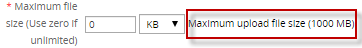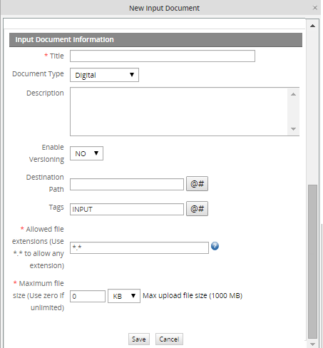 • Maximum file size: Available in version 2.8.0 and later. It is a required field which defines in KB or MB the maximum size of the file to be attached. If set to zero, then the file size is unlimited. Nevertheless, the limit is configured inside the php.ini file by the upload_max_size setting and that limit is shown in parenthesis when creating an Input Document.