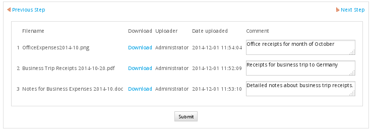 Note: The "filename" and "url" fields in the grid can be combined into a single link field whose label displays the filename, but it requires using JavaScript in the DynaForm to set the labels to the link fields before version 2.5.0 or creating "url" and "url_label" keys in the array in version 2.5.0 and later. See: Accessing Links with Triggers.