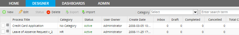 Login as the "admin" user or another user which has the PM_FACTORY permission in its role, so it can edit processes. Go to the DESIGNER menu, and click the New link at the top left of the list of processes. Enter a name, description and select a Category for the new process and click on Create.