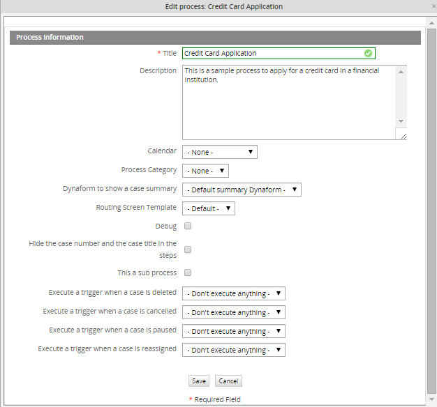 - Process Type: Public, the process is available to all users to be edited. Private, the process is only available to the current user, owner of the process.