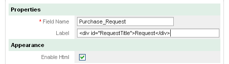 For instance, your "Request" form has a dropdown box named "RequestType" where the user can select the options "Purchase Request", "Travel Request" or "Vacation Request". The title of the form can change to reflect the option selected by the user. In the definition of the title object, activate the option "Enable Html" and change the title Label from "Request" to "Request".
