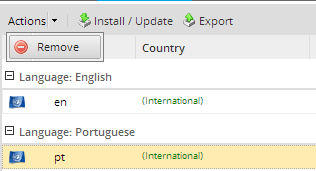 To delete a language from the ProcessMaker system, login into the ProcessMaker workspace where the language was originally installed. For example, if the language was originally installed in the "sales" workspace, then log into that workspace. Go to ADMIN > Settings > Language and select the language in the list by clicking on it so it is highlighted. Then, go to the Action menu and select the Remove option.