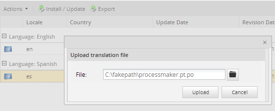 To import a new language, click on the Import / Update button at the top of the list of languages. Click on the file button to select the PO translation file which you downloaded. ProcessMaker will accept either normal PO files or PO files which are compressed with gzip.