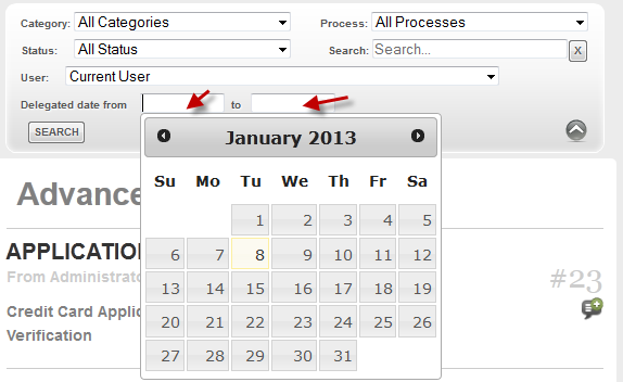 To choose dates to be searched, click on the textbox next to the respective field and a calendar will be displayed: