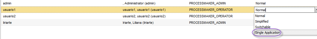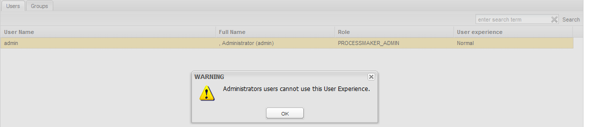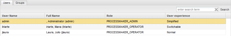 Log into ProcessMaker with a user, such as the "admin", who has the PM_USERS permission in his/her role. Then, go to ADMIN > Users > User Experience: