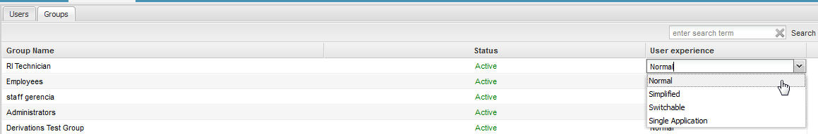 To change a user's interface, click on a user in the User Experience column. Then select an option in the dropdown box that appears: