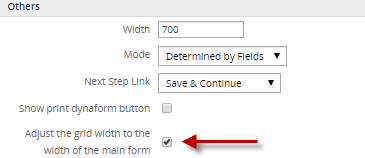 This option allows grid width to be adjusted to the width of the Dynaform master, it means if the Grid is wider than the Dyanform master by selecting this option automatically the width will be adjusted. Click on the "Adjust the grid width of the main form" option displayed on the master form. This option is available from version 2.5.