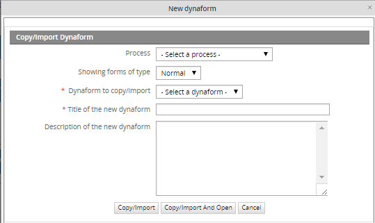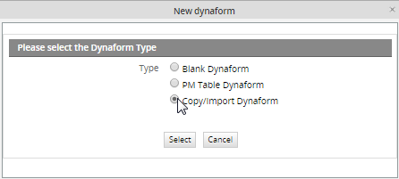 By selecting the option Copy/import a Dynaform, a window will open to select DynaForm to be copied:
