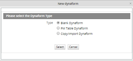 To create a DynaForm from scratch, select the first option Blank Dynaform. To create a DynaForm whose fields are based upon the fields in an existing PM Table, select the second optionPM Table DynaForm. In this case, when the user enters data into the fields in the DynaForm, a new record with that data will automatically be inserted in that PM Table. See PM Table DynaForm below.