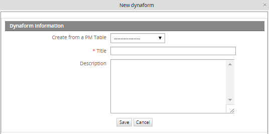 - Create from PM table: Required Field. Select the PM Table from where the DynaForm will be created.