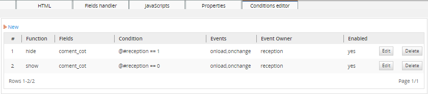 In the DynaForm Editor, go to the Condition Editor tab, to see the list of conditions. To create a new condition, click on the "New" link at the top. The Conditional Show/Hide Editor dialog box will appear where the condition can be defined: