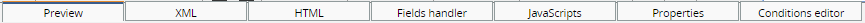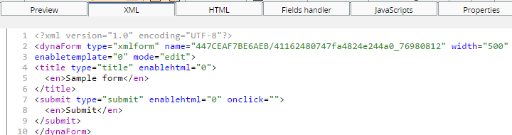 The DynaForm Editor provides a graphical designer for DynaForms, with a toolbar to add new elements to DynaForms and tabs to switch easily between the graphical preview of the form, the code, and the definition of the fields in the form.