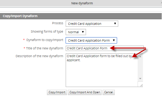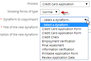 - Dynaform to copy/import: Required Field, all available Dynaforms of the selected process, and depending on the type chosen on a previous field, will be listed: