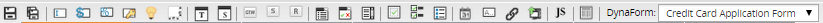 The DynaForm Editor provides a toolbar to easily add fields and other objects to the DynaForm. The toolbar buttons function while in all the DynaForm Editor tabs, so objects can be added to DynaForms at any time, whether using the Preview mode, editing code, viewing the field list, or setting the form properties. Unlike the Process Map toolbar which uses drag-and-drop icons, the icons in the DynaForm Editor toolbar are activated by a single mouse click over the icons.