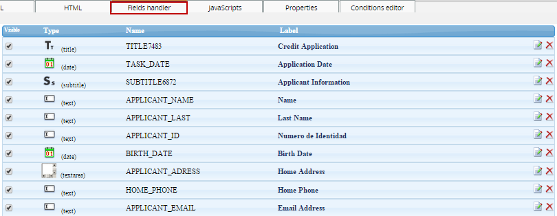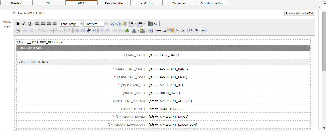 Objects are added to DynaForms in a specific order to DynaForms and can not be moved around freely with the mouse. Instead, objects can only be moved around by changing their order inside the Field List tab or by modifying the HTML code for the form. The WYSIWYG HTML editor allows designers to customize the appearance of DynaForms. For process designers who want maximum control over their forms, full access to the HTML code is provided.