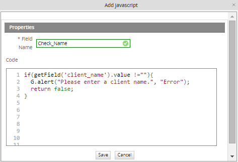Next define the condition, which is a Boolean expression which can evaluate to true or false in JavaScript. If the condition is true, then the function will be executed and show or hide the selected fields. If false, then the function will not be executed, and the appearance of the DynaForm will not change.