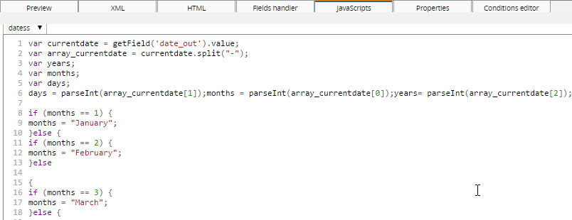 Note that field references will always return the value property of the field, except for checkboxes, which return the checked property. It is not possible to access any other property of the fields, such as @#MyField.disabled; nor is it possible to call any string methods on the fields, such as @#MyField.toUpperCase() or @#MyField.search(). Since checkgroups and radiogroups, do not have a value property, it is not possible to use them inside a condition. It is also not recommended creating a condition which looks for a particular selected value in a listbox, since multiple options can be selected. If using checkgroups, radiogroups or listboxes, it is recommended to use JavaScript to hide and show fields.