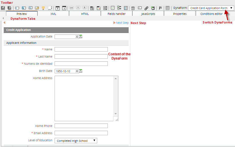 The DynaForm Editor is designed to be user-friendly for process designers who don't have any programming experience, yet also provide the full XML code and the HTML code for process designers who want to customize their forms to their hearts content. DynaForms allow process designers to use SQL queries to pull data from external databases or the ProcessMaker databases. With case variables, data can also be pulled from ProcessMaker triggers and used in the fields in DynaForms. Finally, audacious process designers can add their own custom JavaScript code to dynamically control their DynaForms, error check the data and provide feedback to the user.