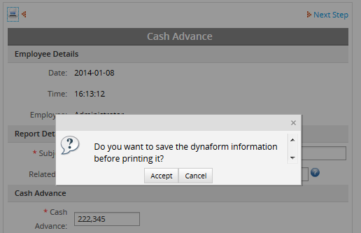- If clicking in Accept button, current Dynaform information will be saved and then the print popup will open.