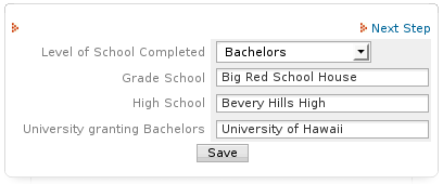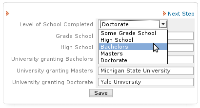 When the users select "Bachelors", they are only asked to enter the name of their grade school, high school and the university which granted the bachelors degree.