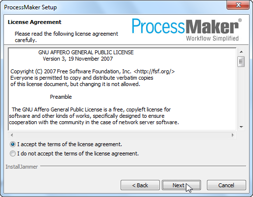 Mark the option to accept the GNU Affero General Public License version 3 license used by ProcessMaker and then click on Next.