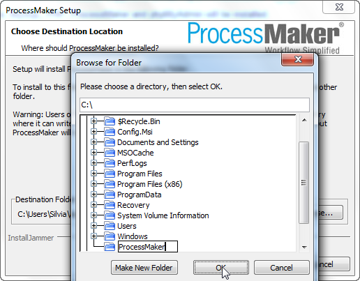 To install in a new directory, click on Make New Folder to create a folder and give it a name, such as ProcessMaker.