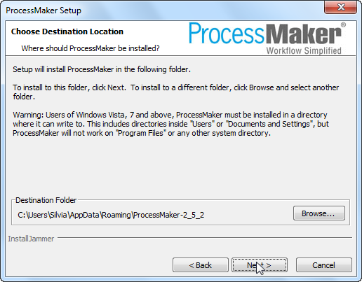New security restrictions in Windows Vista/7/8/Server 2008 don't allow a program running on Apache to write to system files, so ProcessMaker can not be installed in the %ProgramFiles% directory. By default, ProcessMaker will be installed in the user's directory at C:\Users\USERNAME\AppData\Roaming\ProcessMaker-2_X_X
