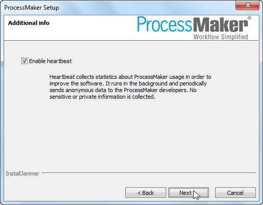 Enable heartbeat. The "Heartbeat" is used to collect anonymous statistics every seven days about the number of workspaces, users and processes being used. This information is collected to help the ProcessMaker developers identify usage patterns and help improve the application in the future. If you do not want this information to be sent to the ProcessMaker developers, do NOT select this option.