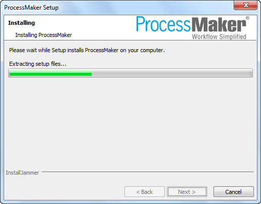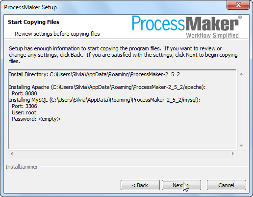 The ProcessMaker Windows Installer based on InstallJammer is designed to automatically install ProcessMaker without asking the user for confusing information such as port numbers for Apache and MySQL and passwords for MySQL and phpMyAdmin. The Windows Installer is designed for quick installations to be used on the local machine. To install ProcessMaker to be used over a local network or on the internet or to configure port numbers and passwords used by Apache, MySQL and phpMyAdmin, either do a manual install of ProcessMaker or reconfigure ProcessMaker after using the automatic installer.