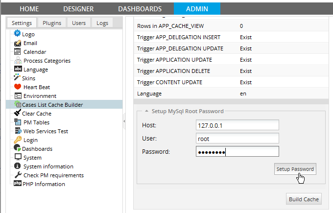 Then, switch to the web browser and login to ProcessMaker as the "admin" user and go to ADMIN > Cases List Cache Builder. Click on Setup MySQL Root Password to expand the section and fill in the following values: